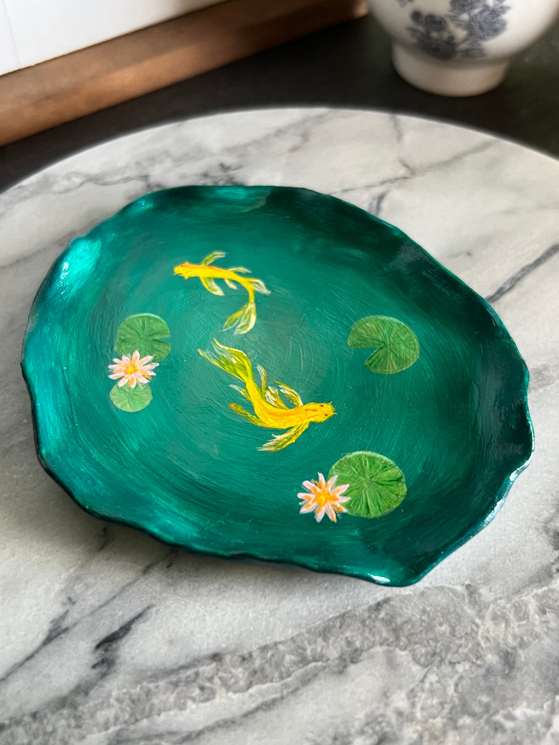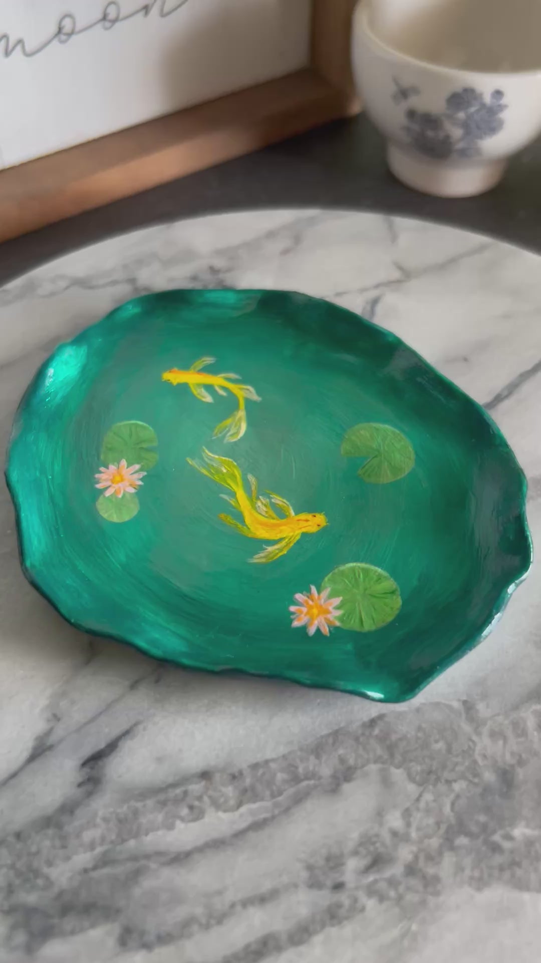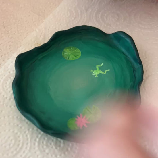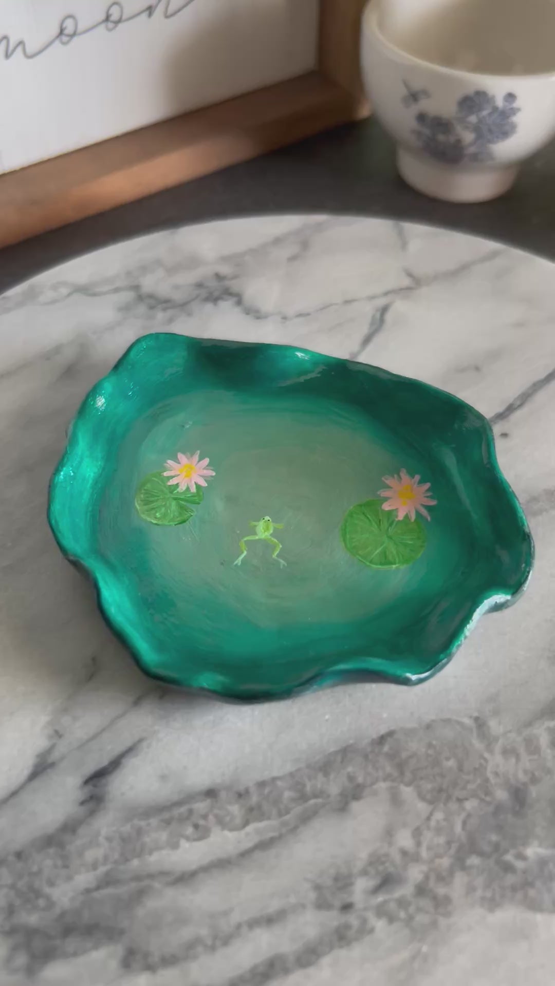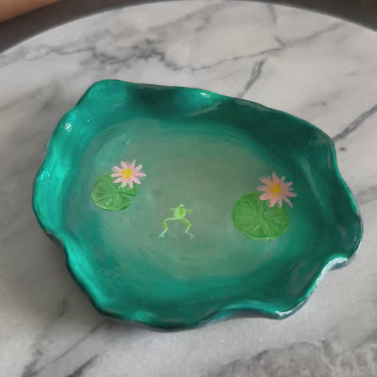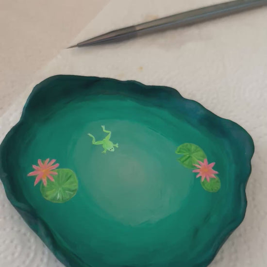 Bring a touch of nature’s serenity to your space with our handmade and hand-painted trinket dish, inspired by the tranquil beauty of a pond. Each dish features delicate lily pads and blooming water lilies, capturing the essence of a peaceful waterscape. Crafted with care, no two are exactly alike—every piece has its own unique brushstrokes and design variations, making yours truly one of a kind. Perfect for holding jewelry, keys, or small treasures, this charming dish is both a functional piece and a tiny work of art. Expect delightful variations that make your dish uniquely yours!